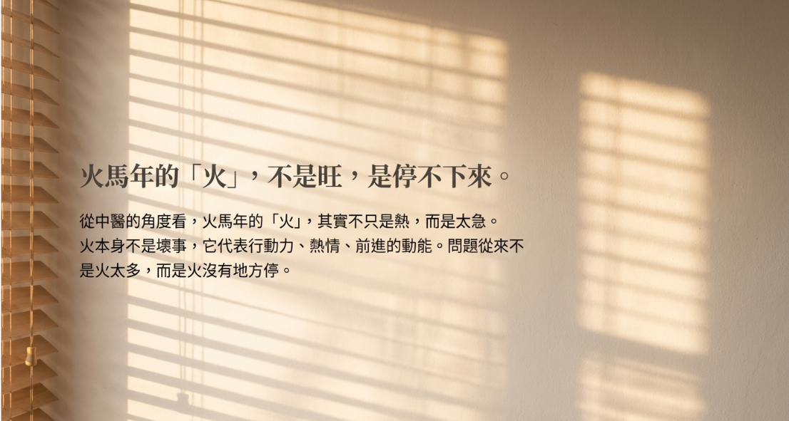 但如果從中醫的角度來看,火馬年的「火」,其實不只是熱,而是太急。