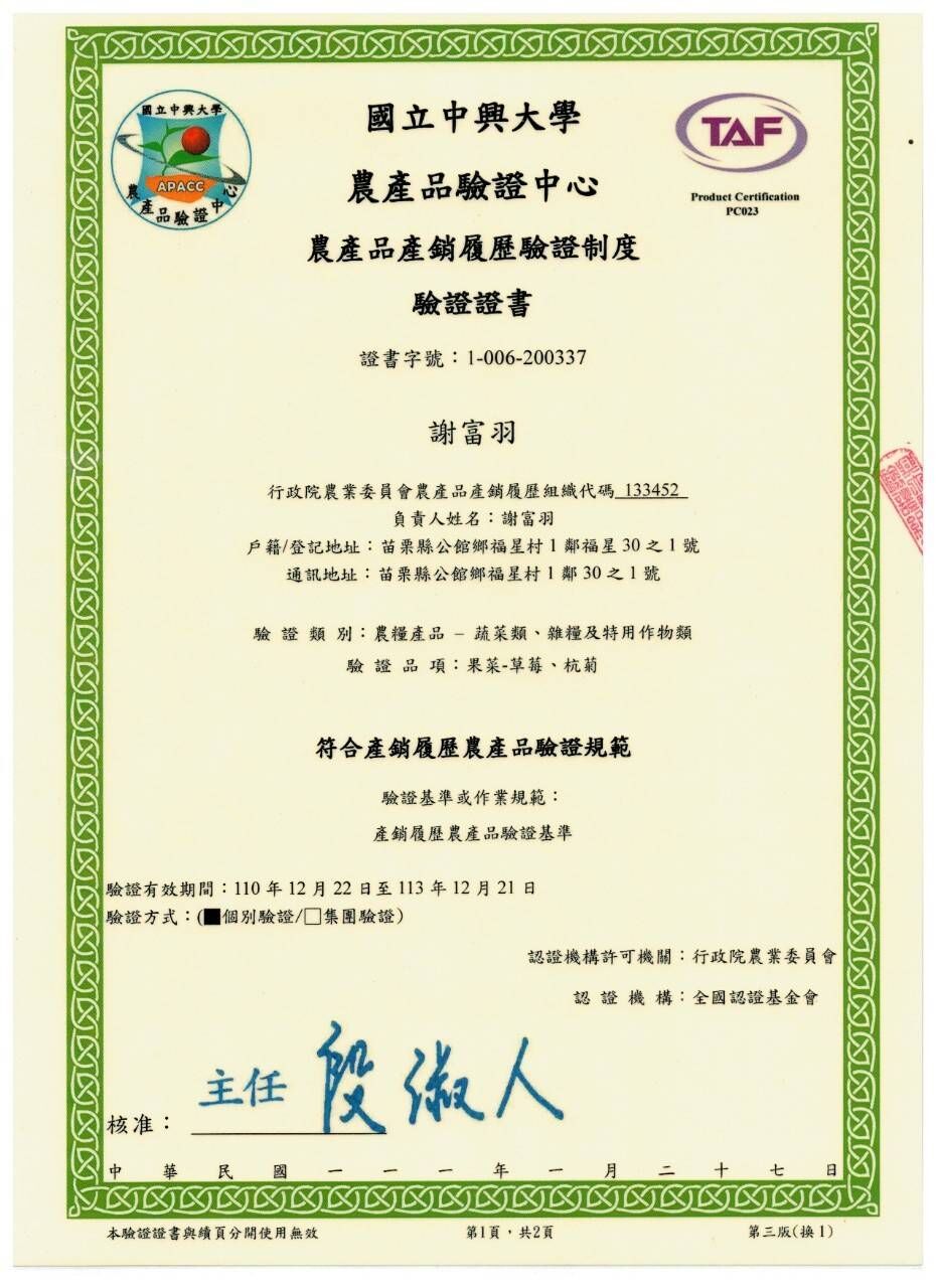 謝富羽的草莓通過產銷履歷驗證,並定期送驗確保農藥檢驗合格,良好的品質不僅是消費者安心的選擇,也是許多知名加工業者的配合對象!