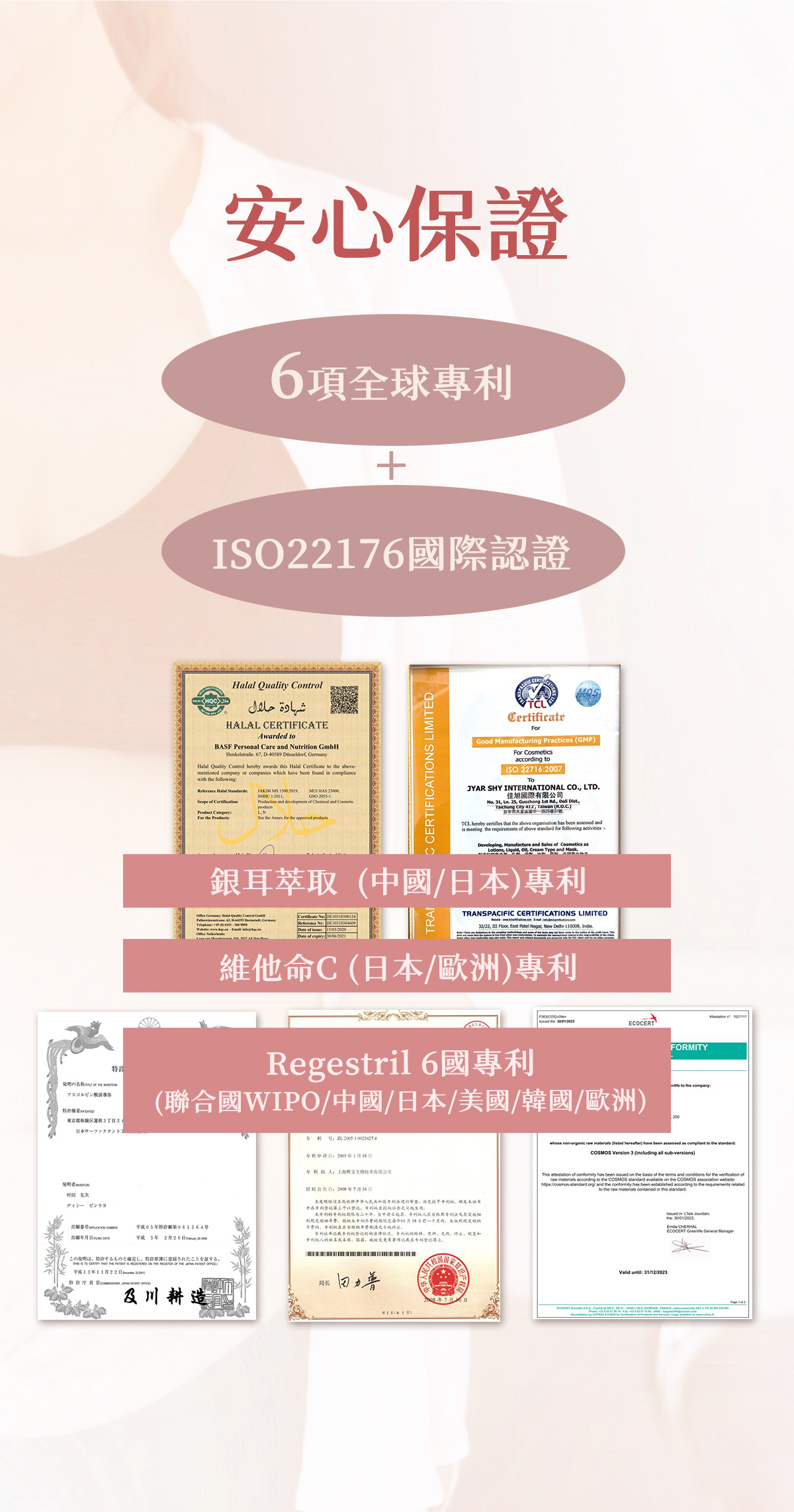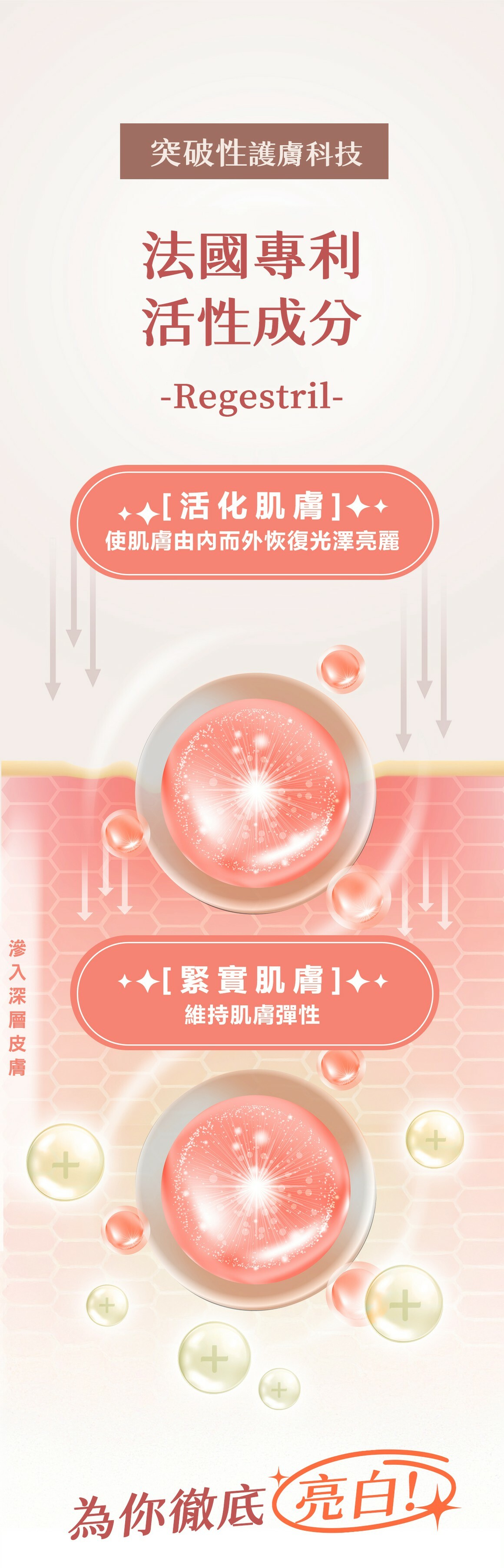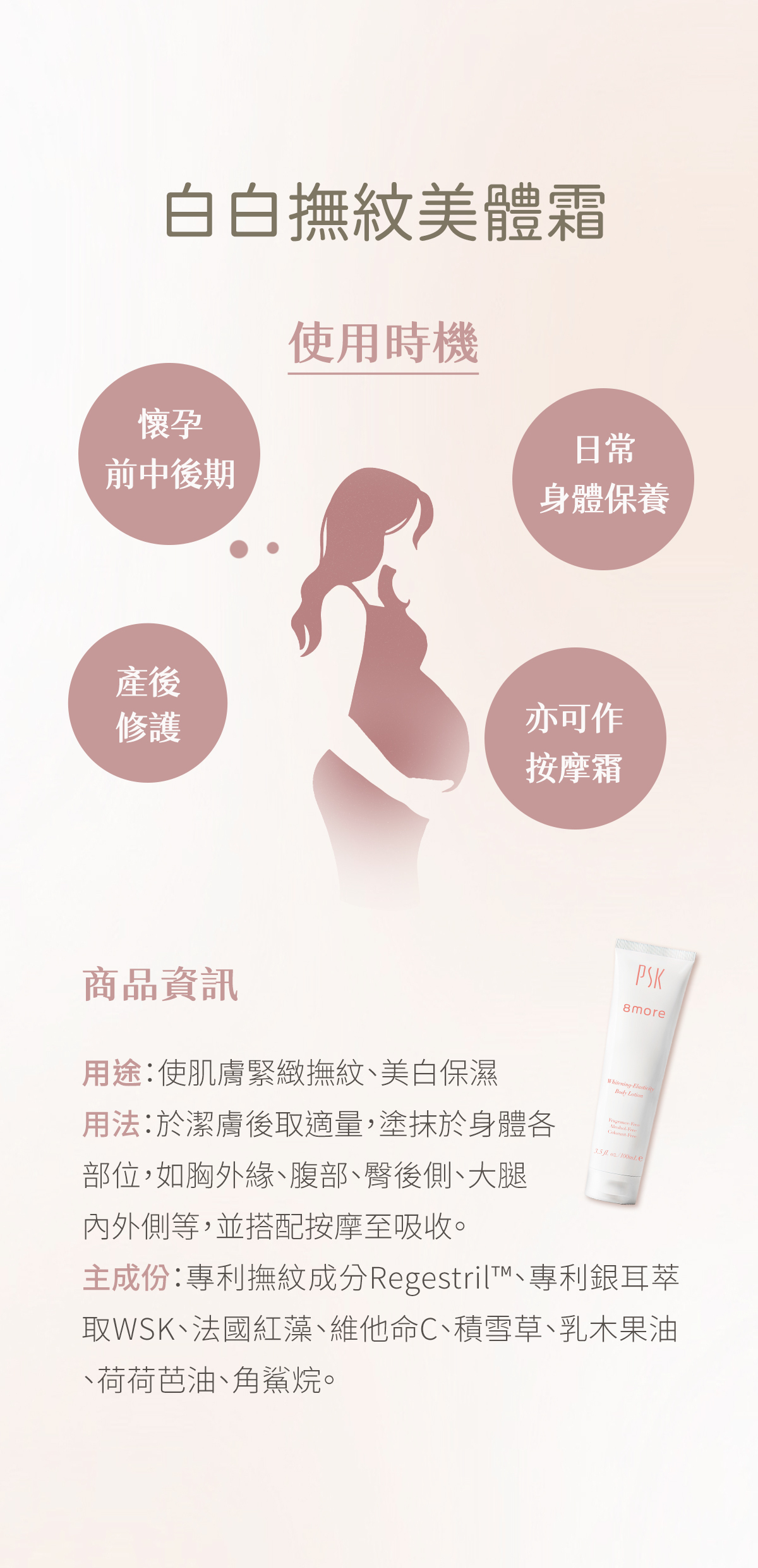 主要成份:法國深海紅藻(OLIGOGELINE®)、維他命C、積雪草萃取、Regestril™專利撫紋成分