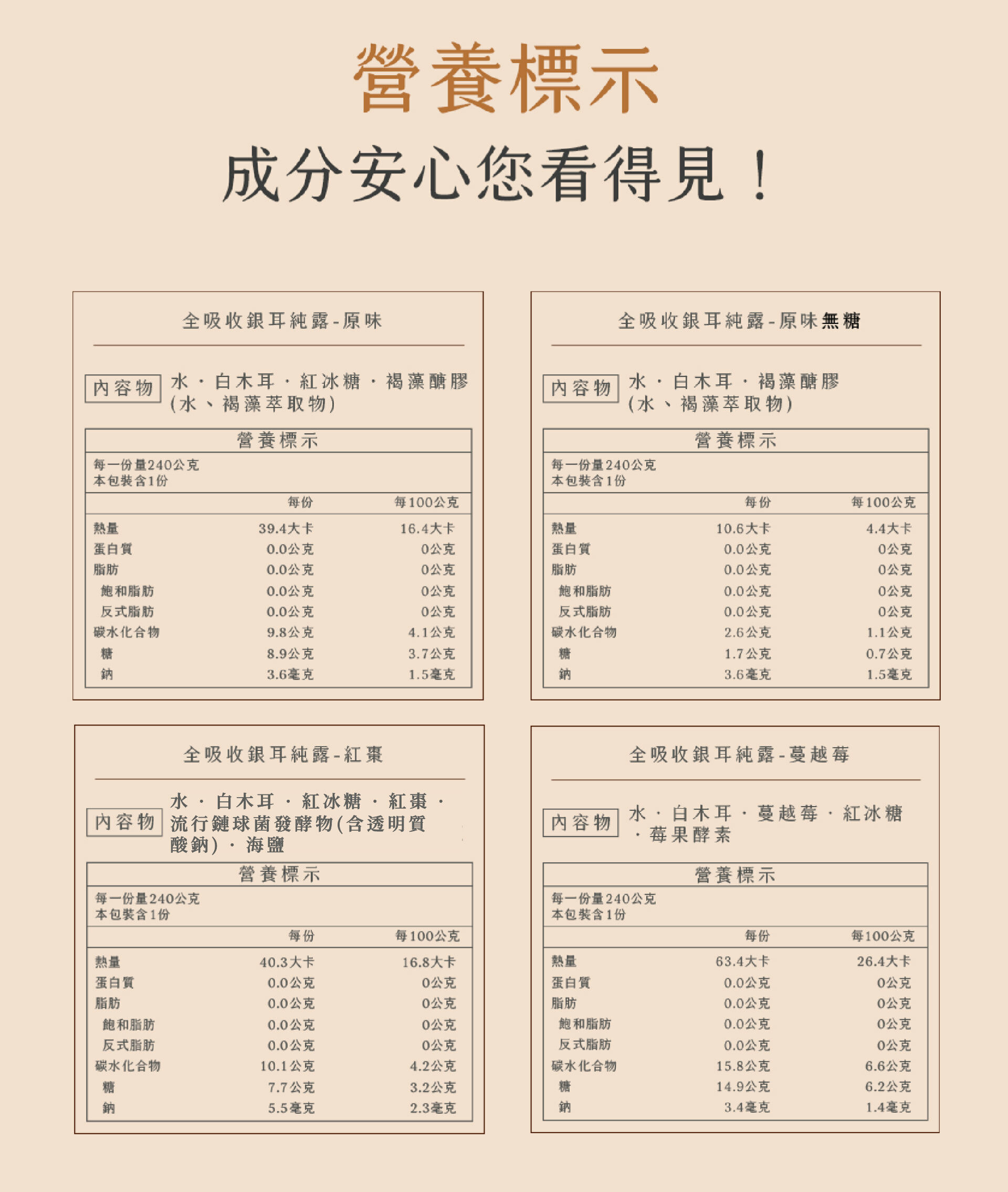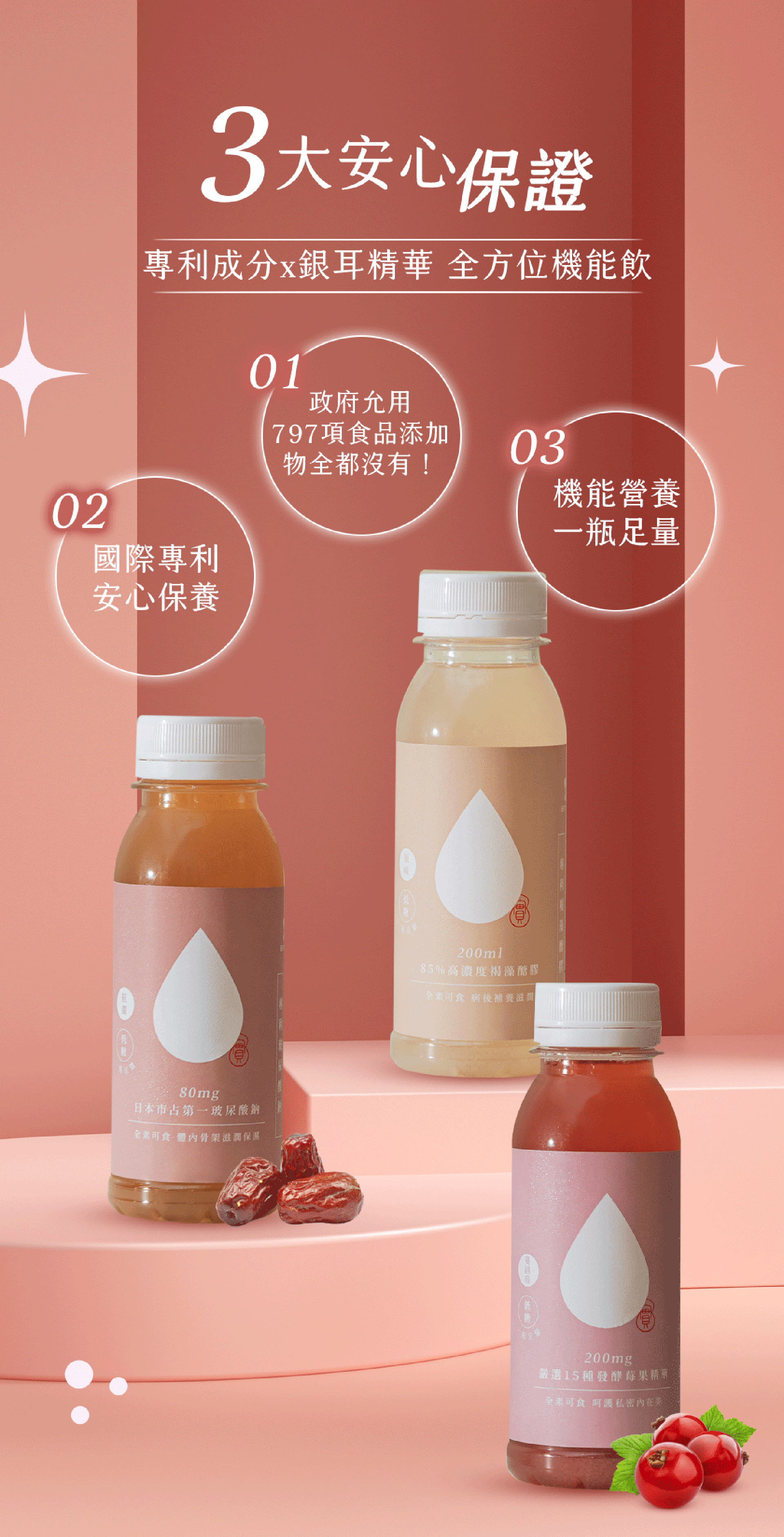 選用日本高品質高分子『品諾褐藻醣膠』,專利有機認證,真正幫助修護,再搭配新鮮白木耳,專人專鍋將銀耳精華完整釋放,成分極為單純,一天一瓶足量全吸收。
