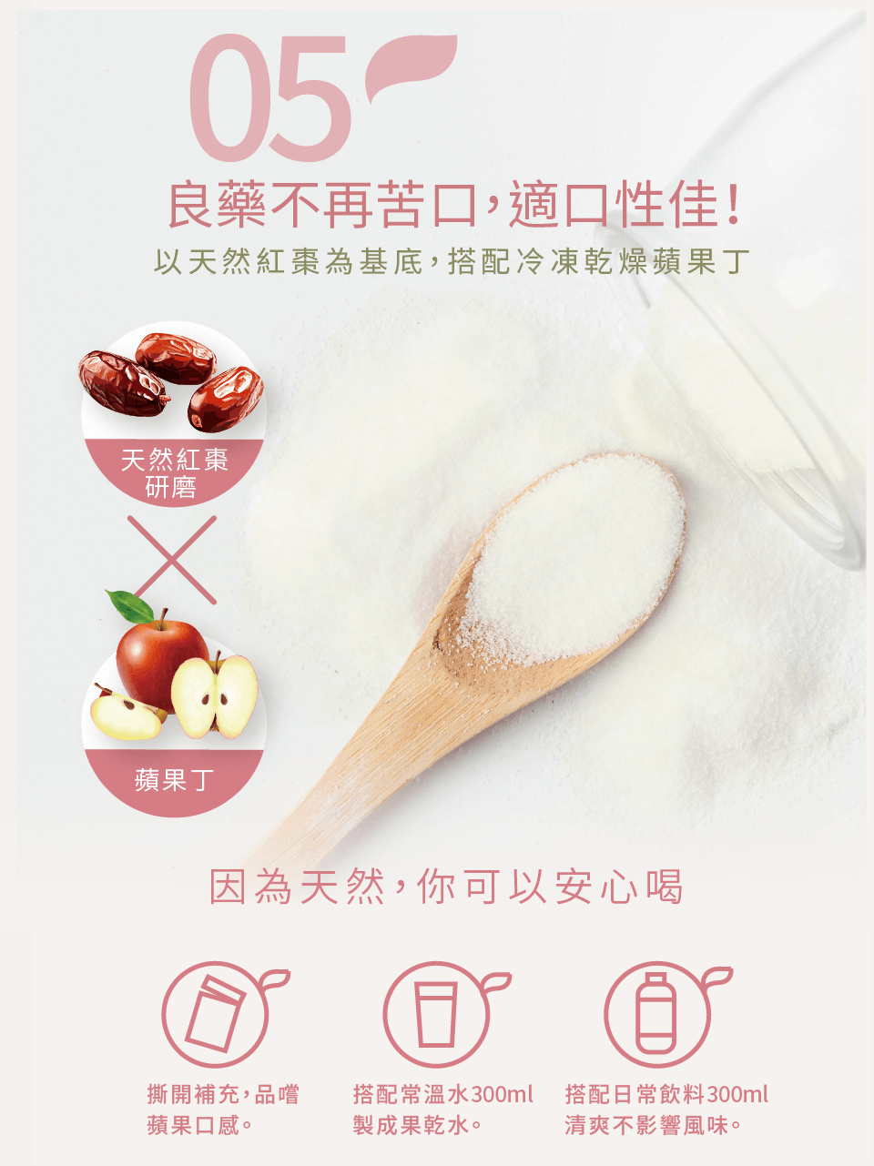 ✓天然口感以紅棗為基底,搭配蘋果丁
