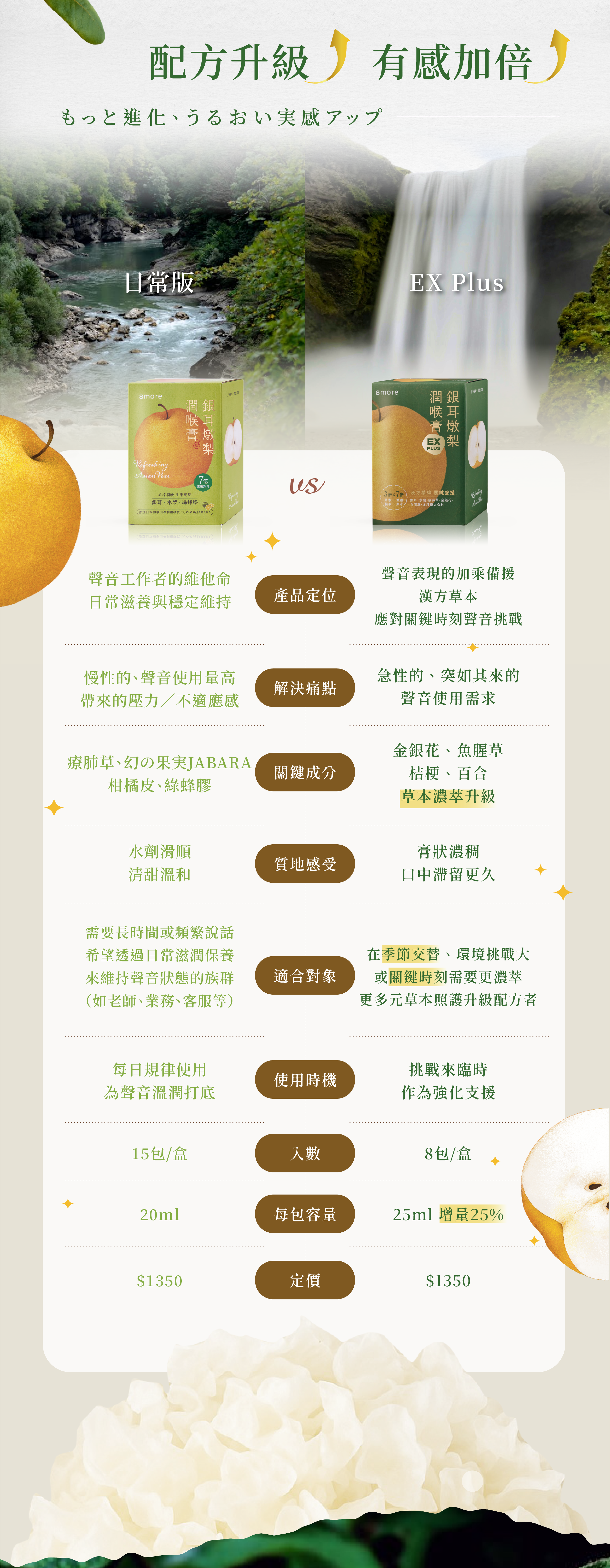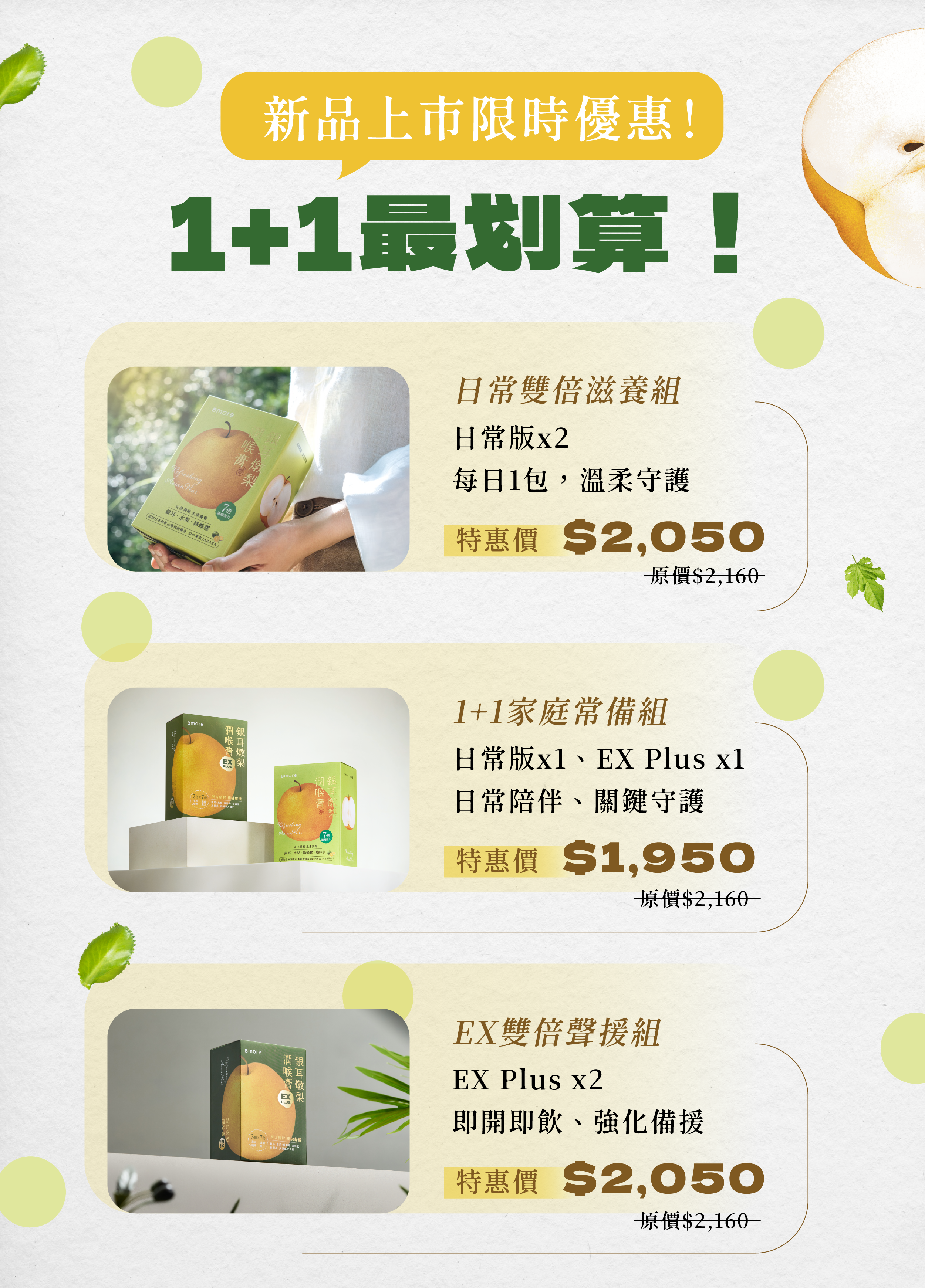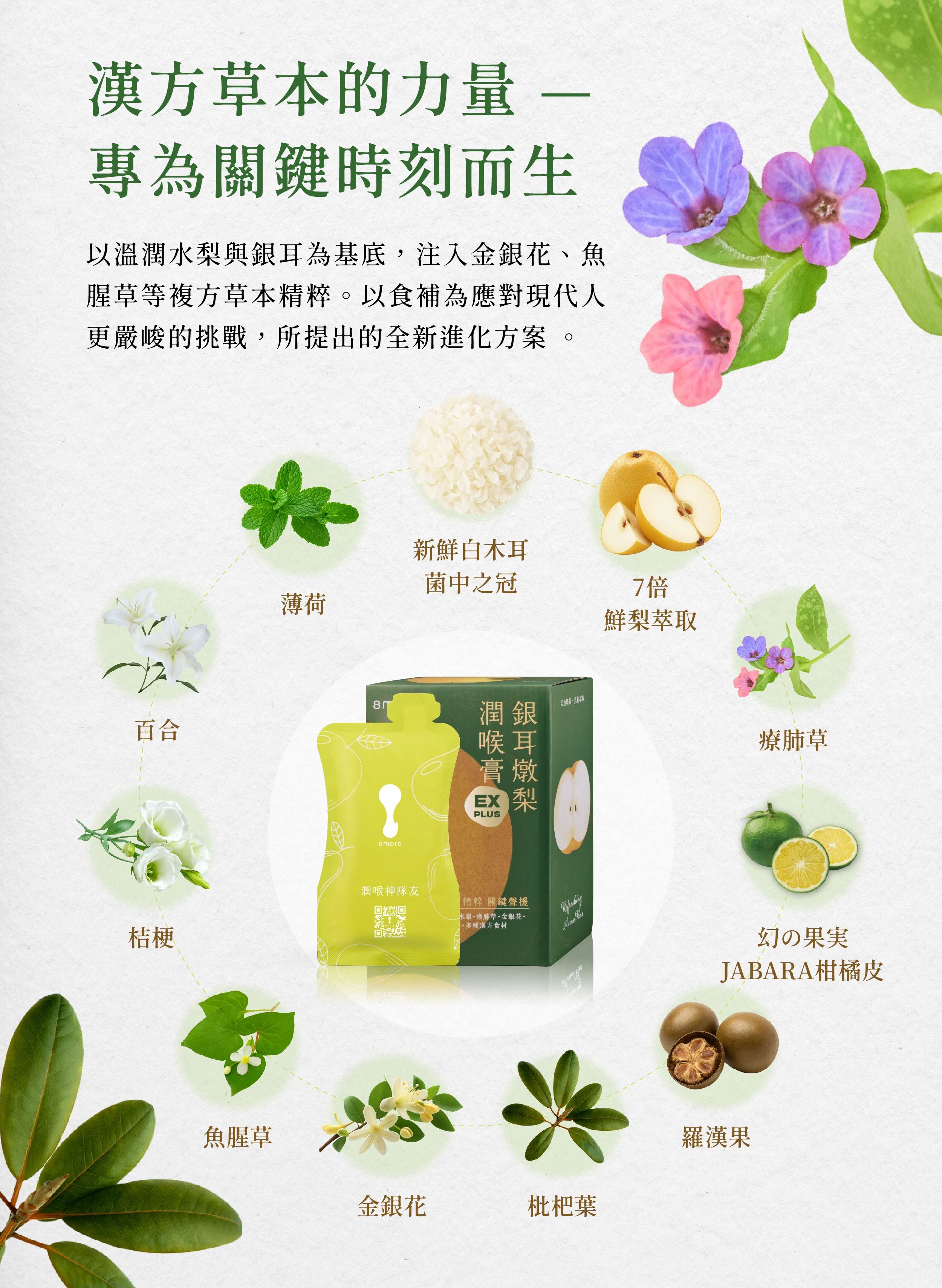 EX版配方口感,全面升級!以溫潤水梨與銀耳為基底,注入金銀花、魚腥草、桔梗、百合等複方草本精粹,質地更濃稠醇厚,提供更完整的關鍵聲援。