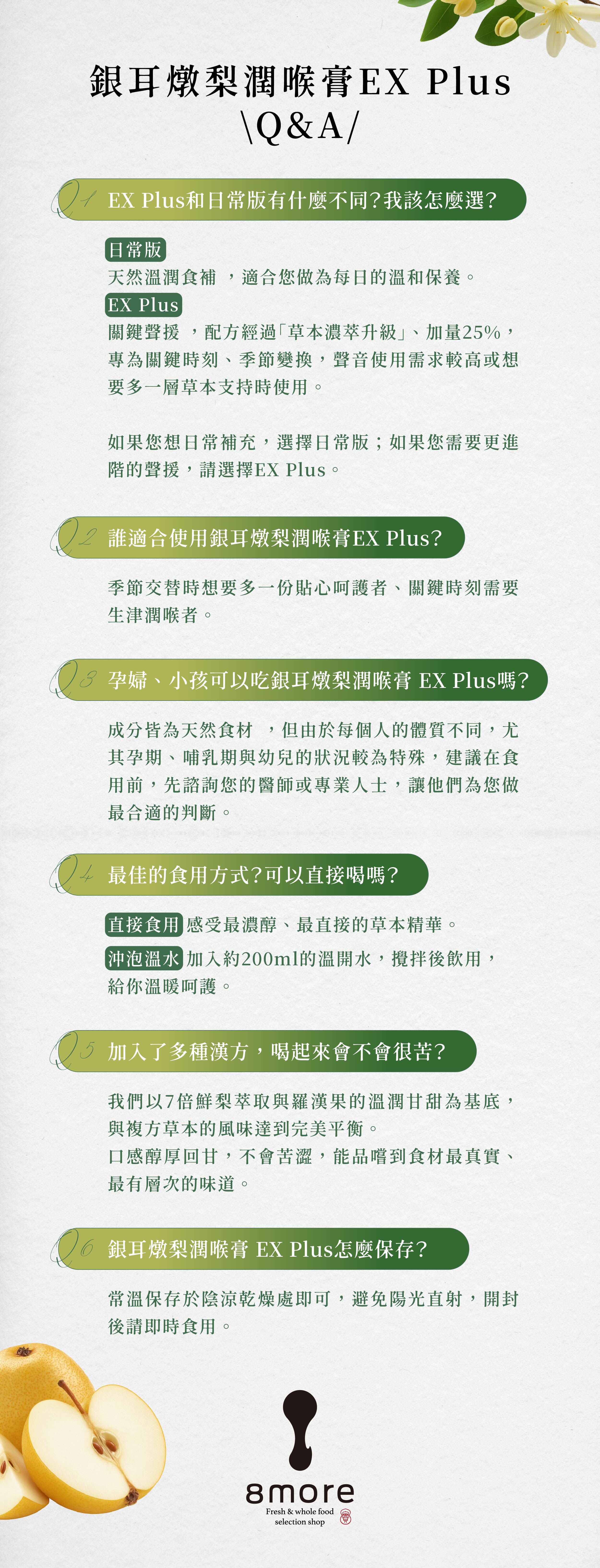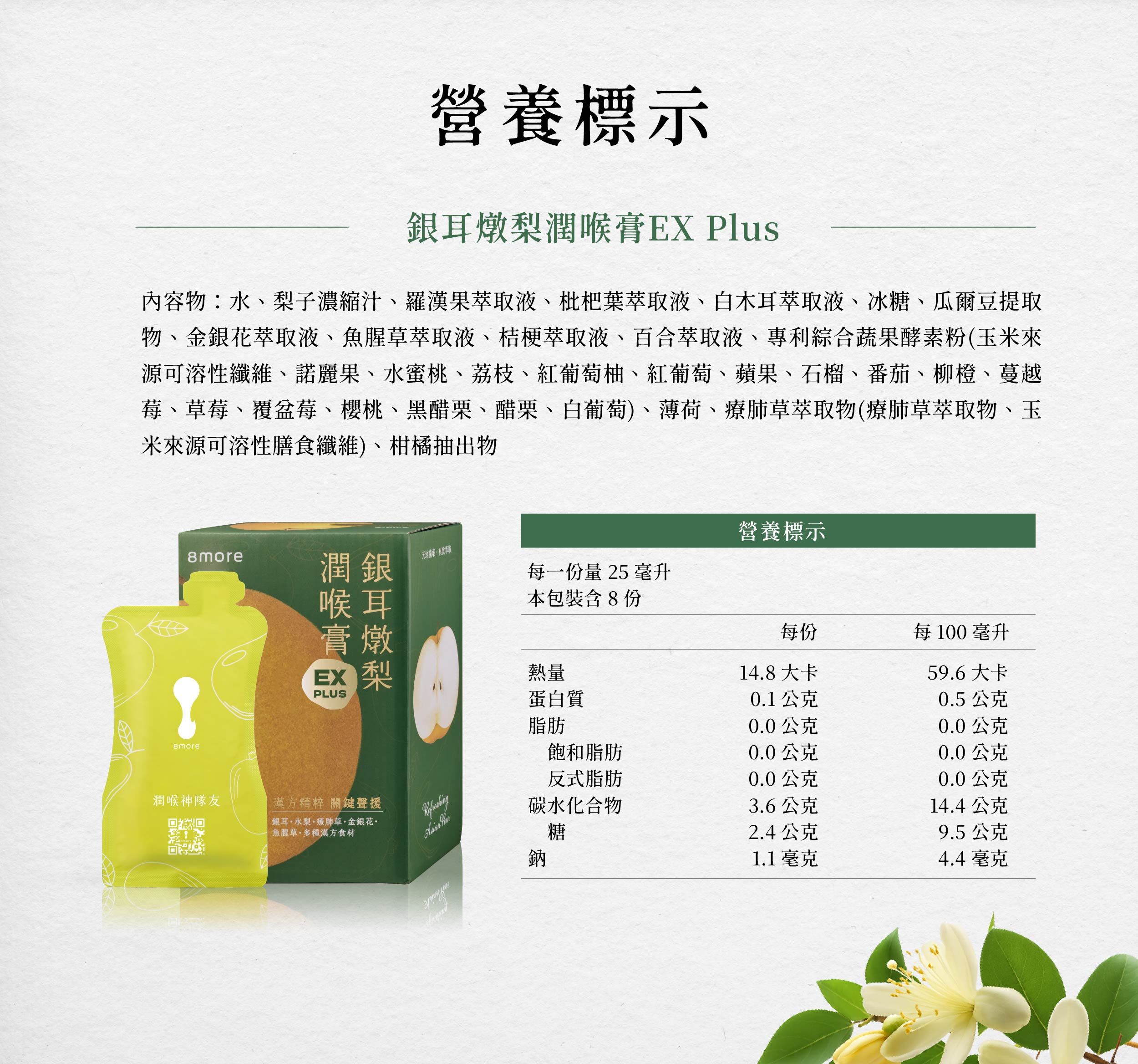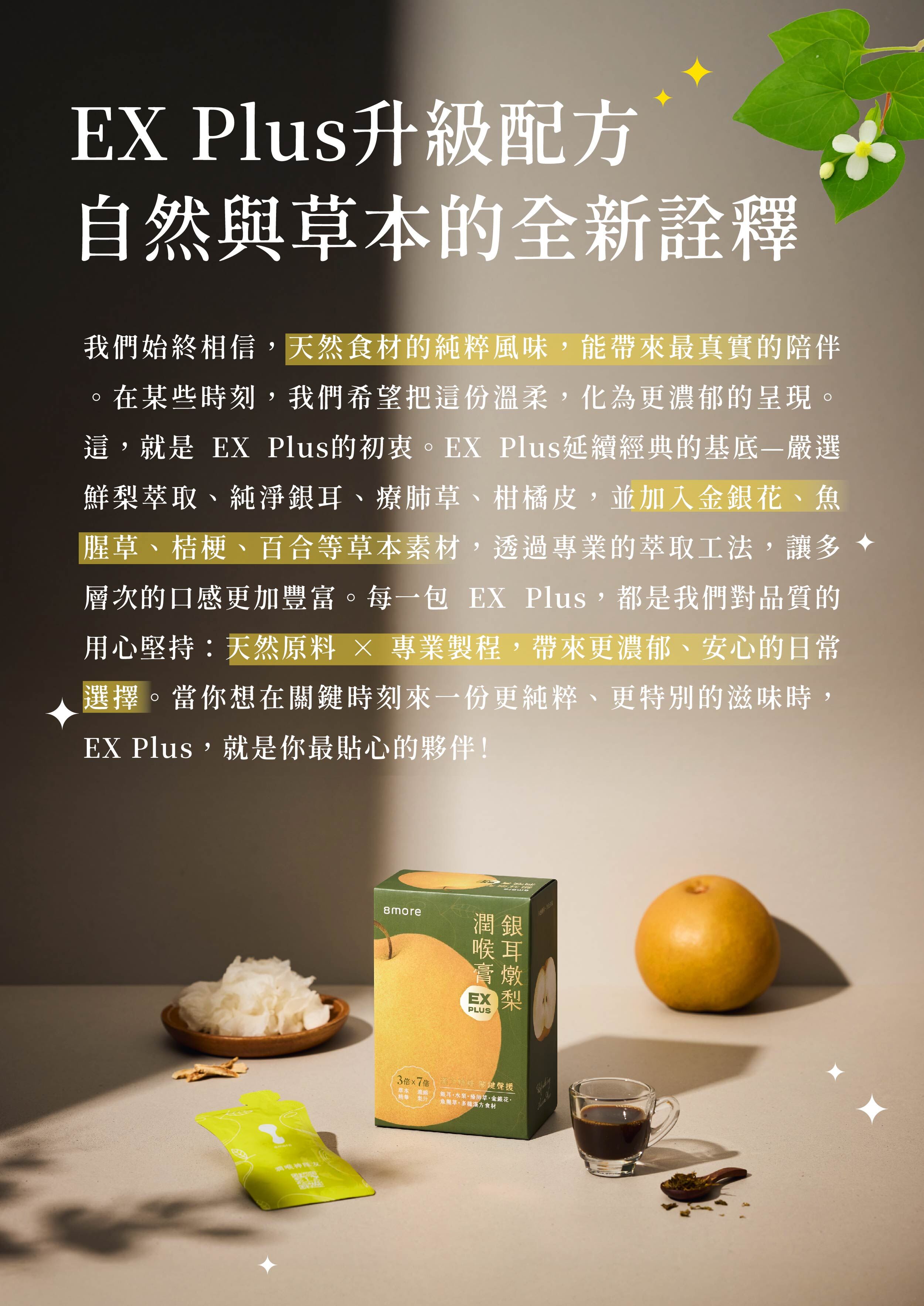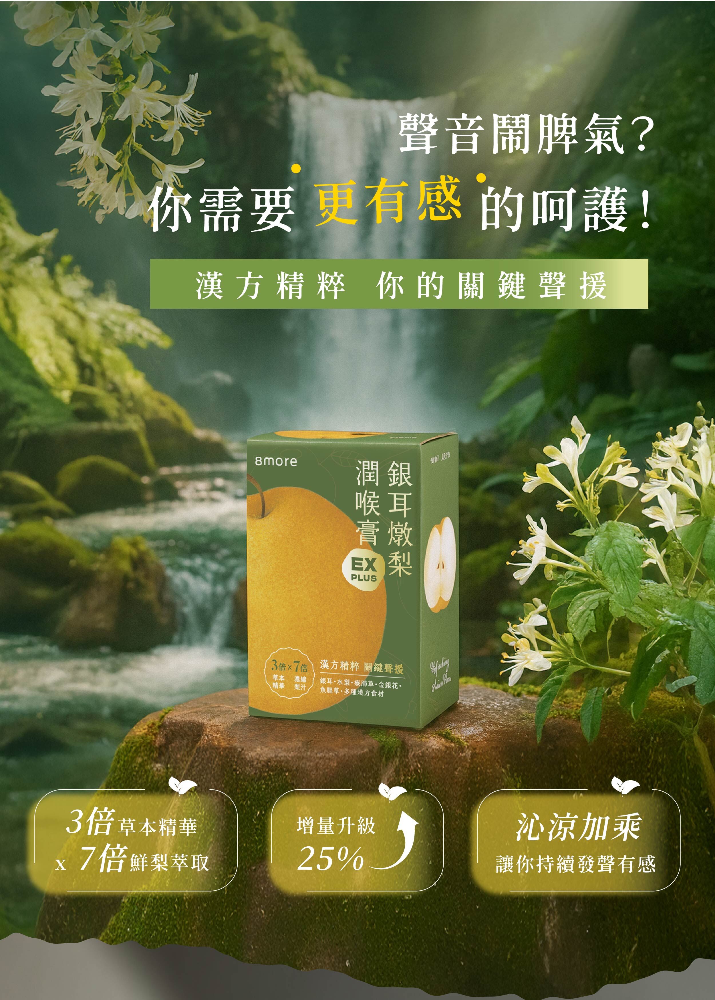 EX版配方口感,全面升級!以溫潤水梨與銀耳為基底,注入金銀花、魚腥草、桔梗、百合等複方草本精粹,質地更濃稠醇厚,提供更完整的關鍵聲援。