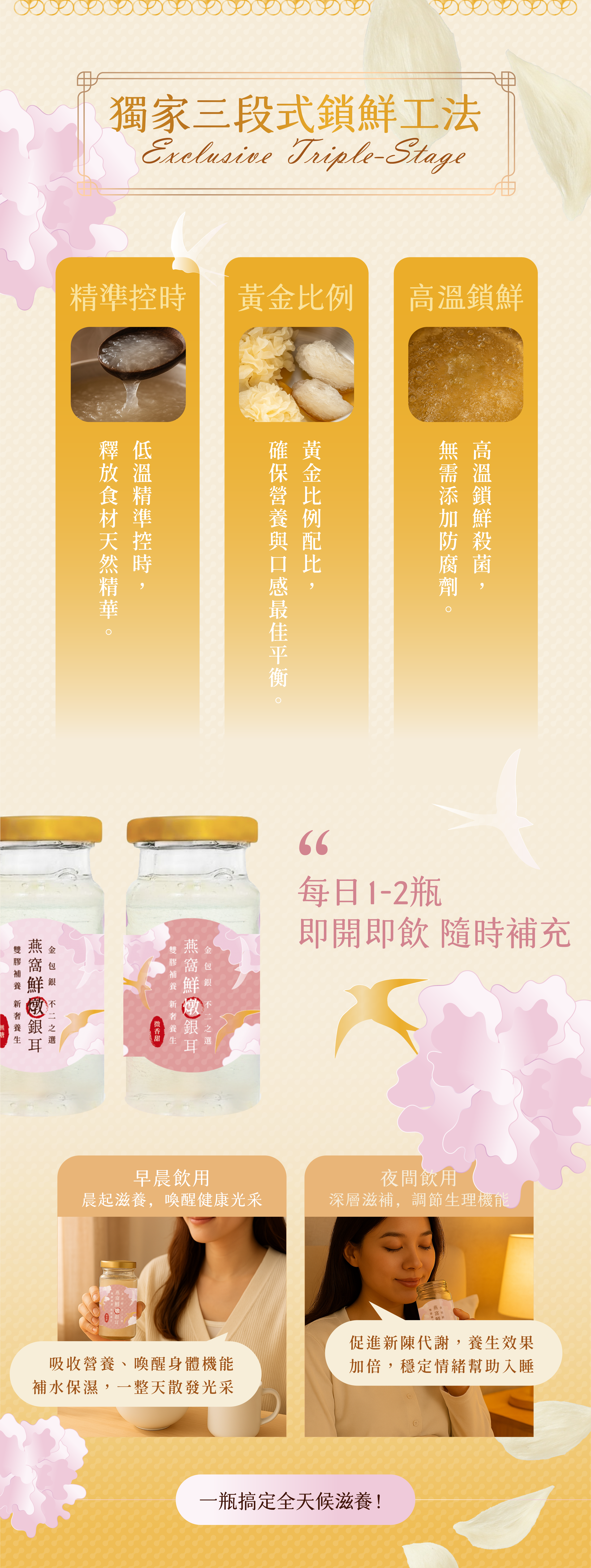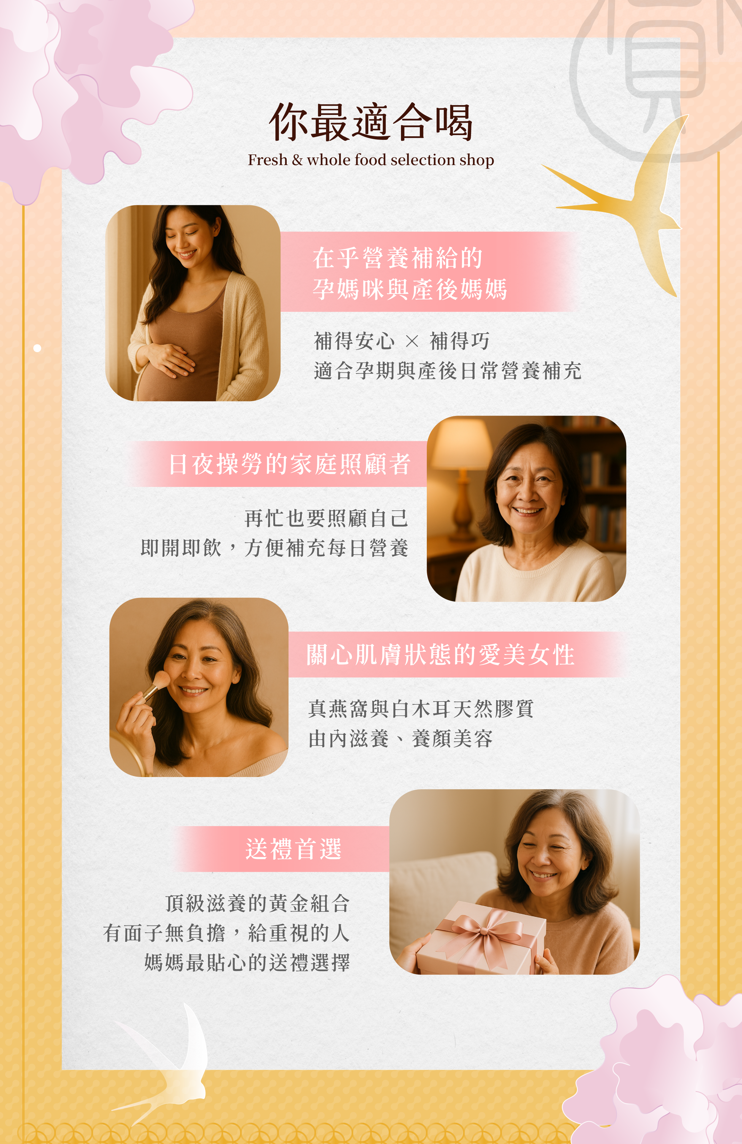 ✔ 使用印尼頂級燕窩+台灣鮮採白木耳,雙膠精華完美互補,養顏美容